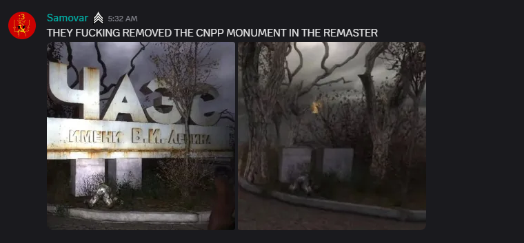 the exclusion of "Soviet references" - speaking of posters, signs, texts, monuments. Monuments? Damn, right. One of the well-known landmarks in the games is the Chernobyl Nuclear Power Plant sign at the entrance of the ill-fated complex. Top half of it - MISSING. Yeah, what's been there for 18+ years since the launch of Shadow of Chornobyl was taken out.